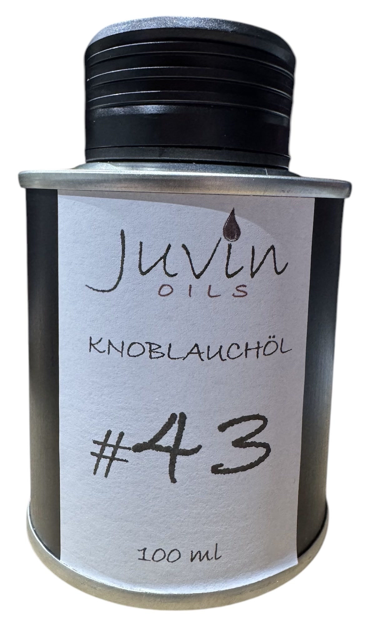 JUVIN Knoblauchöl wird in einer 100 ml fassenden Metallflasche (Weißblech) verkauft. Der Ausgießer ist aus Kunststoff. Vor Gebrauch muss die Versiegelung entfernt werden.